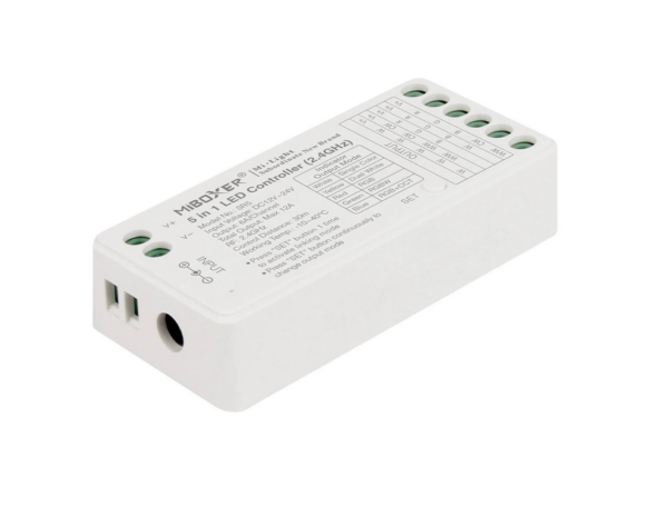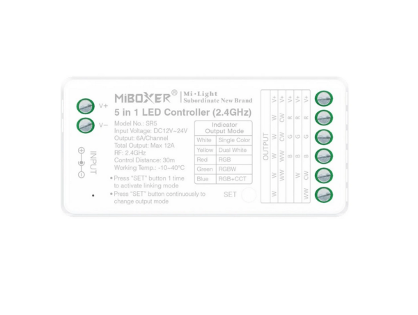 Kontroler SR5 5-v-1 Mi-light je vsestranski kontroler za upravljanje različnih vrst LED osvetlitve (RGB, RGBW, CCT, enobarvne LED). Omogoča napredno upravljanje prek daljinca, mobilne aplikacije ali pametnih asistentov.