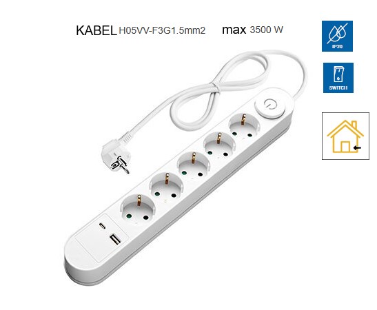 Podaljšek 5 x vtičnica s stikalom in USB priključkom (A+C)
